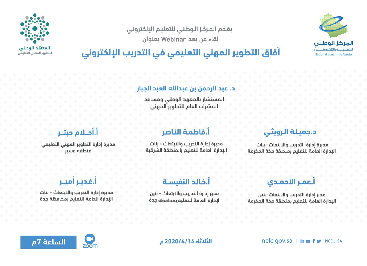 المركز الوطني للتعليم الإلكتروني En Twitter كونوا معنا بعد قليل في لقاء آفاق التطوير المهني التعليمي في التدريب الإلكتروني بمشاركة د عبدالرحمن العبدالجبار المستشار بالمعهد الوطني للتطوير المهني التعليمي وعدد من مدراء الإدارات
