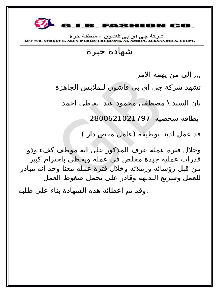 شهادة خبرة Experience Certificate أحمد حسن جبران